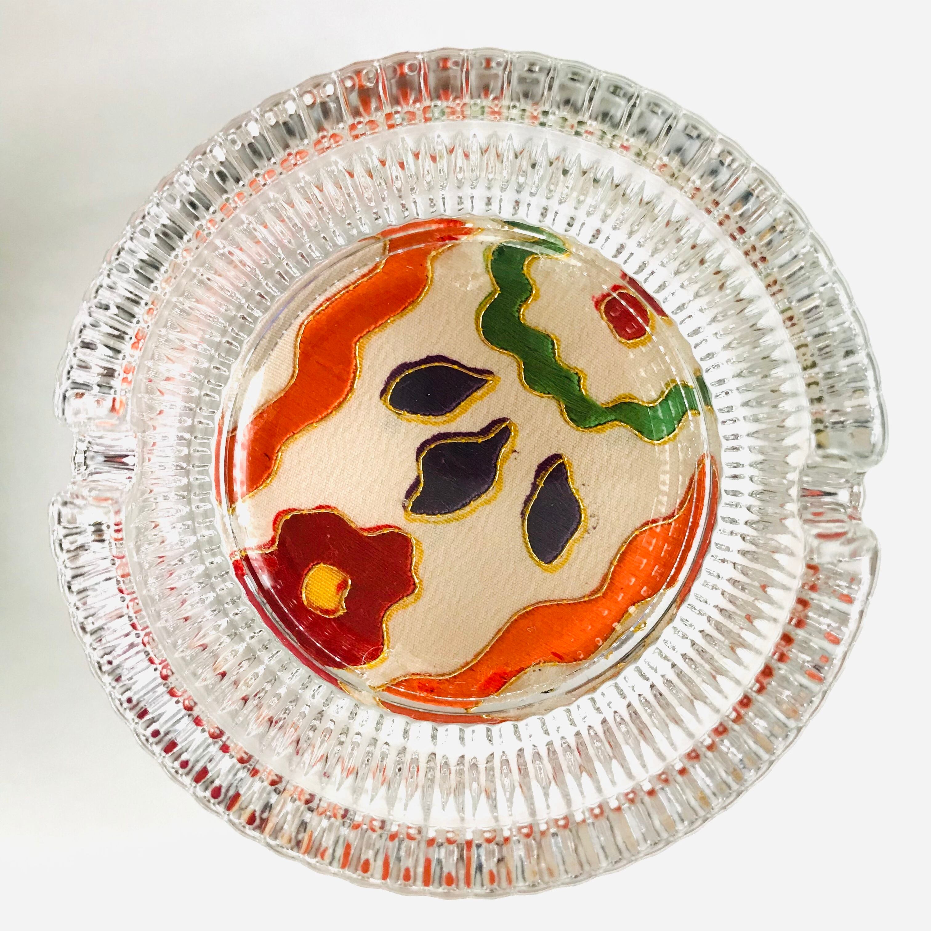 絹の糸で刺繍を施した生地が底に着いたまるい灰皿です。